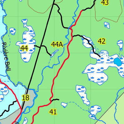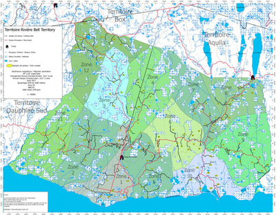 Cette carte présente le territoire de chasse de la Rivière Bell, de la pourvoirie Safari Anticosti, située sur l'île d'Anticosti. Vous y trouverez les sentiers de chasse, les chemins, les cours d'eau les tourbières ainsi que la topographie du terrain.