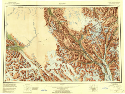 A 1952 historical topographic map of Skagway in Alaska produced by the United States Geological Survey (USGS). It shows contour lines, place names, water bodies and roads. Map services and data available from U.S. Geological Survey, National Geospatial Program. Map was obtained from https://www.s...