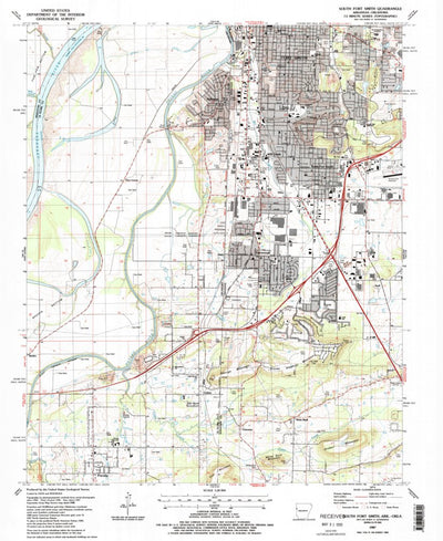 A 1987 historical topographic map of South Fort Smith in Arkansas produced by the United States Geological Survey (USGS). It shows contour lines, place names, water bodies and roads. Map services and data available from U.S. Geological Survey, National Geospatial Program. Map was obtained from ht...