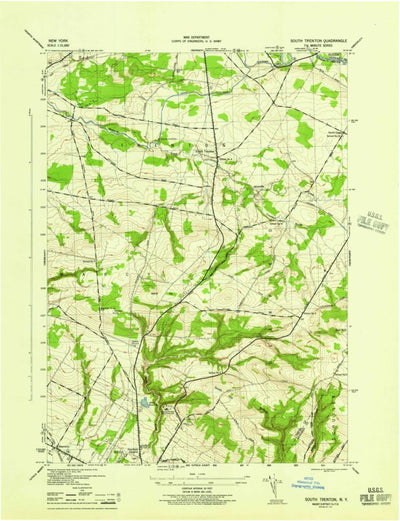 A 1945 historical topographic map of South Trenton in New York produced by the United States Geological Survey (USGS). It shows contour lines, place names, water bodies and roads. Map services and data available from U.S. Geological Survey, National Geospatial Program. Map was obtained from https...