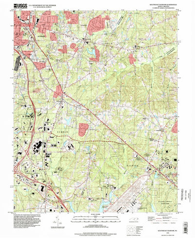 A 1993 historical topographic map of Southeast Durham in North Carolina produced by the United States Geological Survey (USGS). It shows contour lines, place names, water bodies and roads. Map services and data available from U.S. Geological Survey, National Geospatial Program. Map was obtained f...