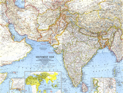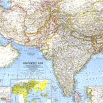 Published in May 1963, this map of Southwest Asia includes inset maps of Bombay, Calcutta, and Karachi, as well as a map showing the Moslem populations in the region. A fine companion for the map of Southeast Asia printed in 1961.