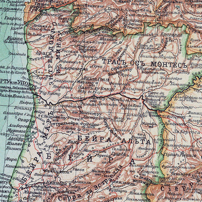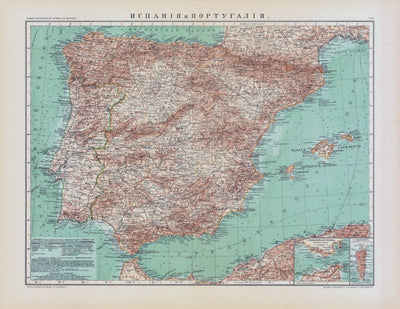 Old vintage map of the Iberian Peninsula from 1910, located in Spain, produced by Marx Adolf & Co.'s Geographic Establishment. The map is drawn to the scale of 1:2,750,000 and contains inset(s) drawn to scale(s) of 1:100,000, 1:1000,000. This digitally re-mastered image is a part of the Discu...