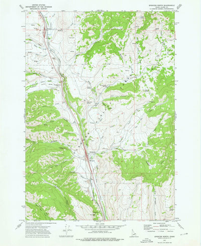 A 1972 historical topographic map of Spencer North in Idaho produced by the United States Geological Survey (USGS). It shows contour lines, place names, water bodies and roads. Map services and data available from U.S. Geological Survey, National Geospatial Program. Map was obtained from https://...