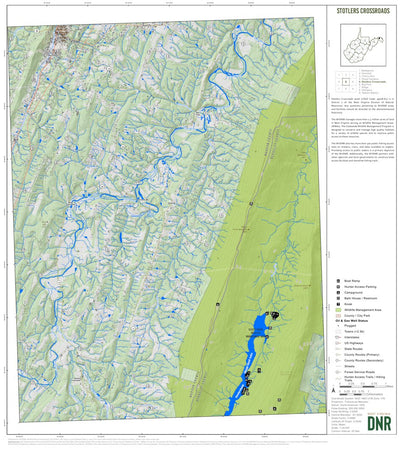 This map was produced using USGS 7.5-minute quadrangles. The maps shows locations of public lands including, but not limited to national forests, state forests, wildlife management areas, and county/city parks in the Stotlers Crossroads quadrangle. The map also shows West Virginia Division of Nat...