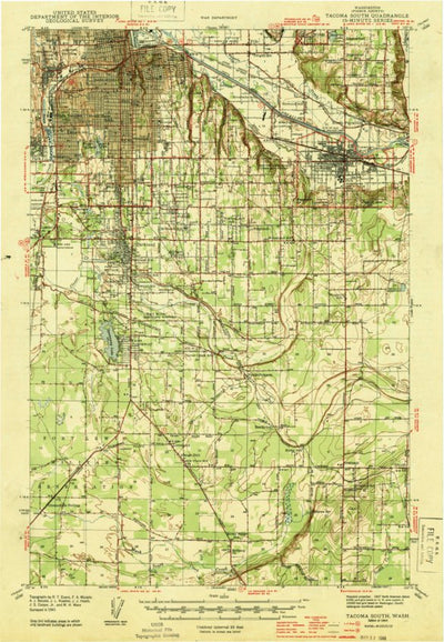 A 1944 historical topographic map of Tacoma South in Washington produced by the United States Geological Survey (USGS). It shows contour lines, place names, water bodies and roads. Map services and data available from U.S. Geological Survey, National Geospatial Program. Map was obtained from http...