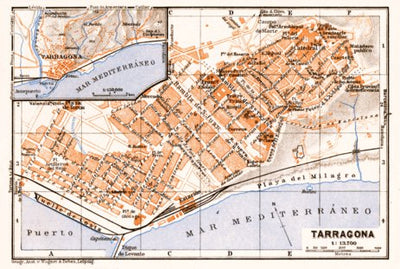 Old vintage map of Tarragona and vicinity of Tarragona map from 1929, located in Spain, produced by Wagner & Debes, at the scale of 1:13,700. This digitally re-mastered image is a part of the Discus Media 1900 Collection.