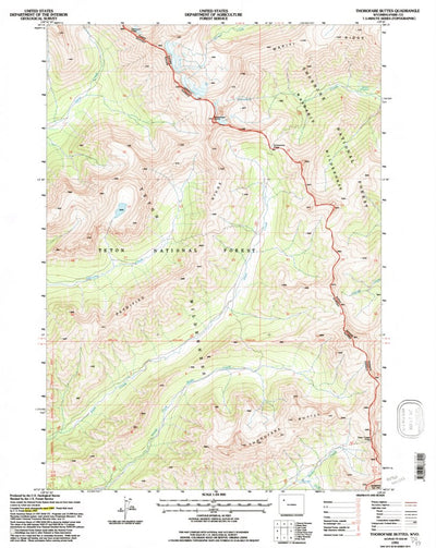 A 1991 historical topographic map of Thorofare Buttes in Wyoming produced by the United States Geological Survey (USGS). It shows contour lines, place names, water bodies and roads. Map services and data available from U.S. Geological Survey, National Geospatial Program. Map was obtained from htt...