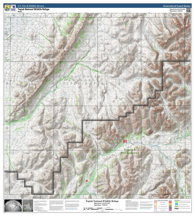 This is a map of Togiak National Wildlife Refuge within the State of Alaska. It depicts the refuge and wilderness boundaries, hillshaded topography, and Federal, State of Alaska, and private ownership boundaries within Togiak NWR.