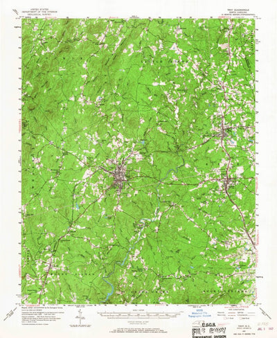 A 1957 historical topographic map of Troy in North Carolina produced by the United States Geological Survey (USGS). It shows contour lines, place names, water bodies and roads. Map services and data available from U.S. Geological Survey, National Geospatial Program. Map was obtained from https://...