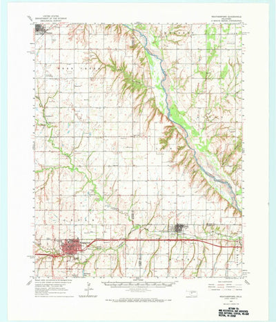 A 1964 historical topographic map of Weatherford in Oklahoma produced by the United States Geological Survey (USGS). It shows contour lines, place names, water bodies and roads. Map services and data available from U.S. Geological Survey, National Geospatial Program. Map was obtained from https:/...
