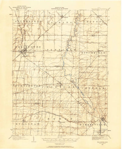 A 1904 historical topographic map of Wellington in Ohio produced by the United States Geological Survey (USGS). It shows contour lines, place names, water bodies and roads. Map services and data available from U.S. Geological Survey, National Geospatial Program. Map was obtained from https://www....