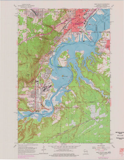 A 1954 historical topographic map of West Duluth in Minnesota produced by the United States Geological Survey (USGS). It shows contour lines, place names, water bodies and roads. Map services and data available from U.S. Geological Survey, National Geospatial Program. Map was obtained from https:...