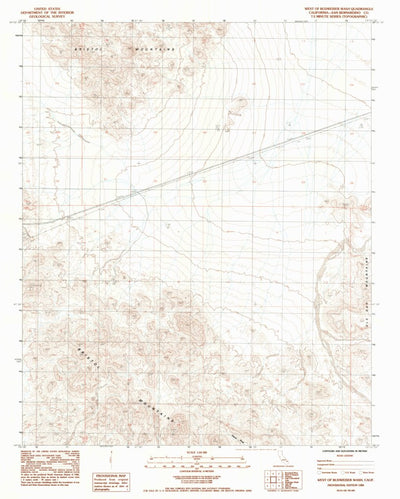 A 1984 historical topographic map of West Of Budweiser Wash in California produced by the United States Geological Survey (USGS). It shows contour lines, place names, water bodies and roads. Map services and data available from U.S. Geological Survey, National Geospatial Program. Map was obtained...