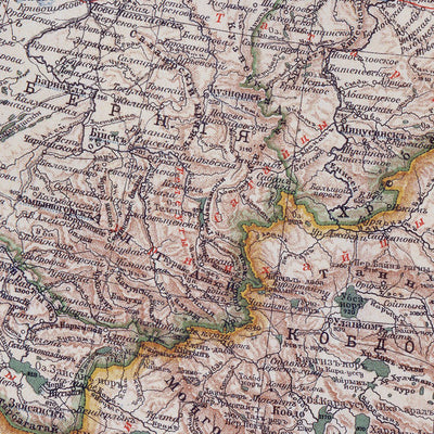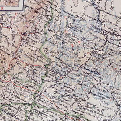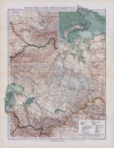 Old vintage map of Russia to the east of the Ural Mountains up to Krasnoyarsk and Turkestan from 1910, located in Russia, then in the Russian Empire, produced by Marx Adolf & Co.'s Geographic Establishment. The map is drawn to the scale of 1:10,000,000 and contains inset(s) drawn to scale(s) ...