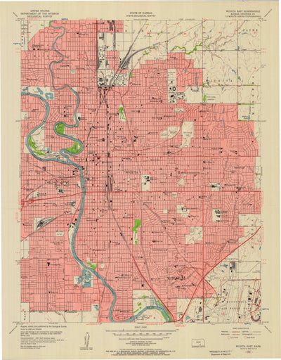 A 1956 historical topographic map of Wichita East in Kansas produced by the United States Geological Survey (USGS). It shows contour lines, place names, water bodies and roads. Map services and data available from U.S. Geological Survey, National Geospatial Program. Map was obtained from https://...