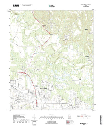 A digital topographic map of Willow Springs in Alabama produced by the United States Geological Survey (USGS) in 2020. The map is part of the National Map series of 7.5 minute quadrangle maps. It shows contour lines, place names, water bodies and roads. Map services and data available from U.S. G...