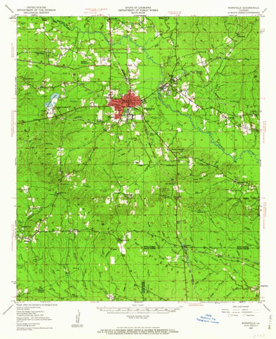 A 1950 historical topographic map of Winnfield in Louisiana produced by the United States Geological Survey (USGS). It shows contour lines, place names, water bodies and roads. Map services and data available from U.S. Geological Survey, National Geospatial Program. Map was obtained from https://...