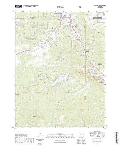 A digital topographic map of Woodland Park in Colorado produced by the United States Geological Survey (USGS) in 2022. The map is part of the National Map series of 7.5 minute quadrangle maps. It shows contour lines, place names, water bodies and roads. Map services and data available from U.S. G...