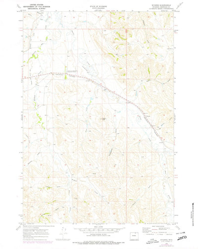 A 1968 historical topographic map of Wyarno in Wyoming produced by the United States Geological Survey (USGS). It shows contour lines, place names, water bodies and roads. Map services and data available from U.S. Geological Survey, National Geospatial Program. Map was obtained from https://www.s...