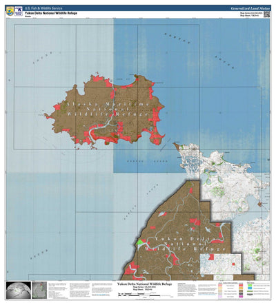 This is a map of Yukon Delta National Wildlife Refuge within the State of Alaska. It depicts the refuge and wilderness boundaries, hillshaded topography, and Federal, State of Alaska, and private ownership boundaries within Yukon Delta NWR.